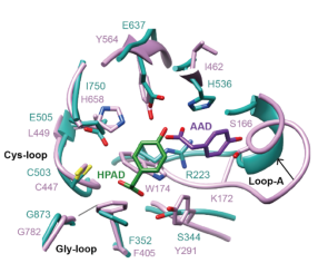 AAD(紫色,底物深紫色)与HPAD(绿色,底物深绿色)的活性中心结构对比。