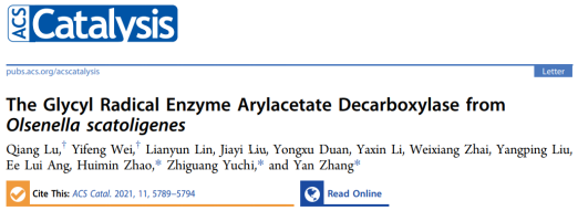 2021年04月23日,天津大学药学院张雁教授研究团队联合尉迟之光副教授和美国伊利诺伊大学香槟分校(UIUC)Huimin Zhao教授及其领导的新加坡科学与工程研究所(A*STAR)研究团队在美国化学会期刊《ACS Catalysis》上发表题为“The glycyl radical enzyme arylacetate decarboxylase from Olsenella scatoligenes”的科技论文(DOI: 10.1021/acscatal.1c01253)。此项研究也是张雁教授课题组继2018年发现吲哚乙酸脱羧酶(Nature Communications DOI: 10.1038/s41467-018-06627-x)及2019年发现羟乙磺酸裂解酶(Nature Communications DOI:10.1038/s41467-019-09618-8)以来,在甘氨酸自由基酶参与氨基酸初级代谢领域研究的又一突破性进展。