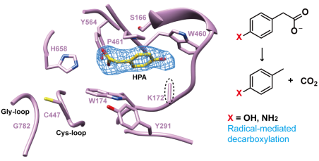 高度恶臭的挥发性化合物对甲酚和粪臭素是厌氧细菌发酵酪氨酸和色氨酸的最终代谢产物,其产生依赖对氧气敏感的甘氨酸自由基酶(GRE)家族成员对羟基苯乙酸脱羧酶(HPAD)和吲哚乙酸脱羧酶(IAD)。张雁团队发现,从猪粪中分离出的厌氧性粪臭杆菌Olsenella scatoligenes除包含HPAD和IAD外,还存在第三种GRE脱羧酶,研究组原以为该酶是苯乙酸脱羧酶(PhdB),参与另一芳香族氨基酸苯丙氨酸的无氧代谢。出乎研究团队意料的实验结果显示其不能催化苯乙酸脱羧,因此该酶不是PhdB;该酶却能催化对羟基苯乙酸和对氨基苯乙酸两种不同底物的脱羧反应,而已知的HPAD不能使对氨基苯乙酸脱羧。