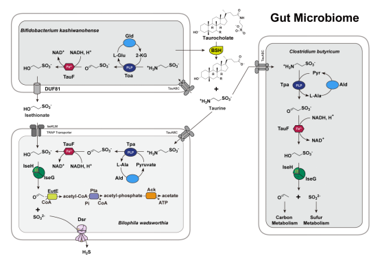 硫是生命的必需元素。含-2价硫的生命化合物被人们熟知:如构成蛋白质的半胱氨酸、甲硫氨酸,生物素、硫胺素、硫辛酸等维生素。含+6价硫的硫酰化糖、蛋白,其理化性质与磷酸化修饰相似,容易被水解。磺酸有机物是一类含C–SO3-功能团的化合物,硫是+4价。其相对缺乏关注,但在自然界中的含量不亚于以上两种含硫化合物,其理化特性决定了自然界中的广泛存在和重要功能。