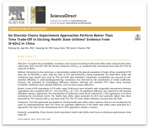 为解决这一基础性科学难题,我院吴晶教授持续聚焦健康效用测量方法学研究,并于2016年获批国家自然科学基金面上项目《基于离散选择实验构建中国大陆人群健康效用积分体系:以SF-6D生命质量量表为例》。该项目基于国际广泛应用、但尚无中国一般人群健康效用积分体系的六维健康调查简表第二版(SF-6Dv2)量表,对传统的时间权衡法(TTO)与新兴的离散选择实验法(DCE)及其衍生的伴有生存时间的离散选择实验法(DCETTO)进行健康效用测量方法学的探索与对比,并基于优选方法构建了SF-6Dv2量表中国一般人群健康效用积分体系。