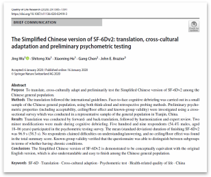 经过为期4年的深入探索与研究,吴晶教授团队顺利完成项目研究内容,取得了一系列高水平研究成果。目前已在卫生政策领域顶级期刊Value in Health(SSCI 1区、SCI 2区、中科院TOP期刊,WOB卫生政策类期刊排名5/87、经济学类期刊排名19/373,2019 IF=4.748)、药物经济学领域顶级期刊PharmacoEconomics(SSCI 1区、SCI 2区,WOB卫生政策类期刊排名8/87、经济学类期刊排名40/373,2019 IF=3.563)、生命质量测量领域权威期刊Quality of Life Research(SSCI 1区、SCI 3区,2019 IF=2.773)等国际高水平期刊发表论文4篇;在《中国卫生政策研究》等中国高水平期刊发表论文2篇。另有3篇英文文章正在撰写待投稿。
