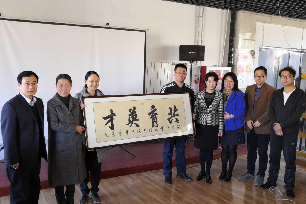 王秀文书记代表海河中学向我院赠送了一方北洋西学学堂时期校址所在地——博文书院(今海河中学校址)的青砖和书法作品“共育英才”,冯翠玲书记代表药学院接过了这两份满载着海河师生情谊的珍贵礼物。