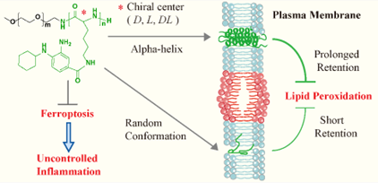 近日,药学院赵燕军和王征教授团队针对这一亟需解决的临床问题,设计了一种具有手性特征的两亲性自由基捕获高分子。该手性高分子具有α-螺旋构象,该类高分子能显著延长细胞膜滞留时间,增强脂质过氧化抑制效能,进而可高效抑制细胞铁死亡,降低促炎细胞因子分泌(图1)。此外,该类高分子还可规避小分子抑制剂的疏水性强、半衰期短、稳定性差等递送问题,并可显著延长血液循环时间。这一概念在细胞和动物模型中得到充分验证,为细胞因子风暴和非可控炎症的治疗提供了新思路和新方法。