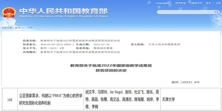 7月24日,教育部发布2022年国家级教学成果奖获奖项目名单,学院教育教学成果《立足国家需求,构建以“PMGE”为核心的药学研究生国际化培养机制》荣获高等教育(研究生)国家级教学成果二等奖。此前,学院国际化人才培养体系于2018年荣获高等教育国家级教学成果奖(本科),2020年荣获全国药学专业学位研究生教育教学成果奖。