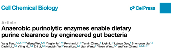 近日,天津大学药学院张雁教授与汪以馼副教授课题组合作在Cell子刊Cell Chemical Biology发表了题为“Anaerobic purinolytic enzymes enable dietary purine clearance by engineered gut bacteria” 的研究论文。此前,嘌呤的降解依赖氧气以及复杂的辅基,该研究首次在微生物中发现并表征了不需要氧气的嘌呤降解新通路,用该通路关键酶改造的工程益生菌掺入到食物中喂养果蝇痛风模型,显著降低其尿酸水平,并延长其寿命。这一发现为高尿酸血症以及痛风的治疗提供了新途径。