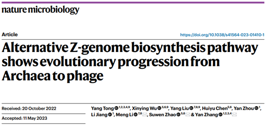 近日,天津大学药学院张雁教授等人在Nature Microbiology发表了题为“Alternative Z-genome biosynthesis pathway shows evolutionary progression from Archaea to phage”的研究论文。该研究发现并表征了Z碱基合成通路关键酶PurZ的变体PurZ0,揭示了PurZ0是古菌PurA到噬菌体PurZ的进化中间体。该发现拓展了Z碱基的生物合成途径,对Z基因组生命起源等的探索具有重要理论意义。