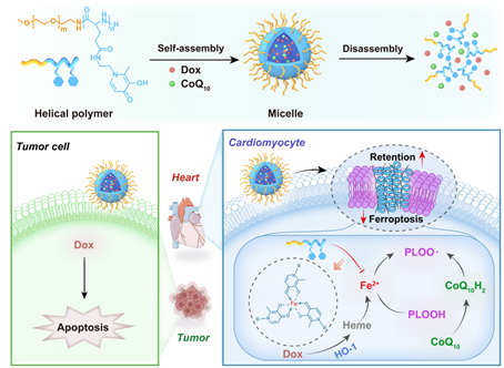 近日,药学院赵燕军和王征教授团队针对阿霉素的心肌毒性问题,设计了一种用于共递送阿霉素和辅酶Q10 (CoQ10)的手性铁螯合高分子胶束。该手性高分子具有α-螺旋构象,能显著增强铁死亡抑制效能;此外,铁螯合和自由捕获具有协同作用,从而可高效降低阿霉素诱发的心脏毒性(图1)。这一概念在小鼠乳腺癌模型中得到验证,高分子胶束显著减轻了阿霉素诱导的心脏毒性,同时显著提高了荷瘤动物生存率。这一工作为蒽环类化疗药物的增效减毒提供了新思路和新方法。