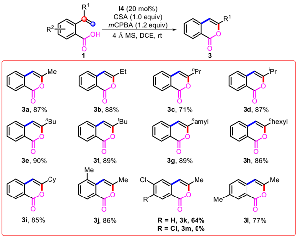 随后,课题组继续探索了底物中烯基部分的取代基效应。当取代基R1 是甲基时,并没有得到期望的1,2-烷基迁移产生的异苯并呋喃酮产物。而是得到了苯甲酸骨架的芳基发生1,2-迁移的六元环异香豆素类产物 3a。