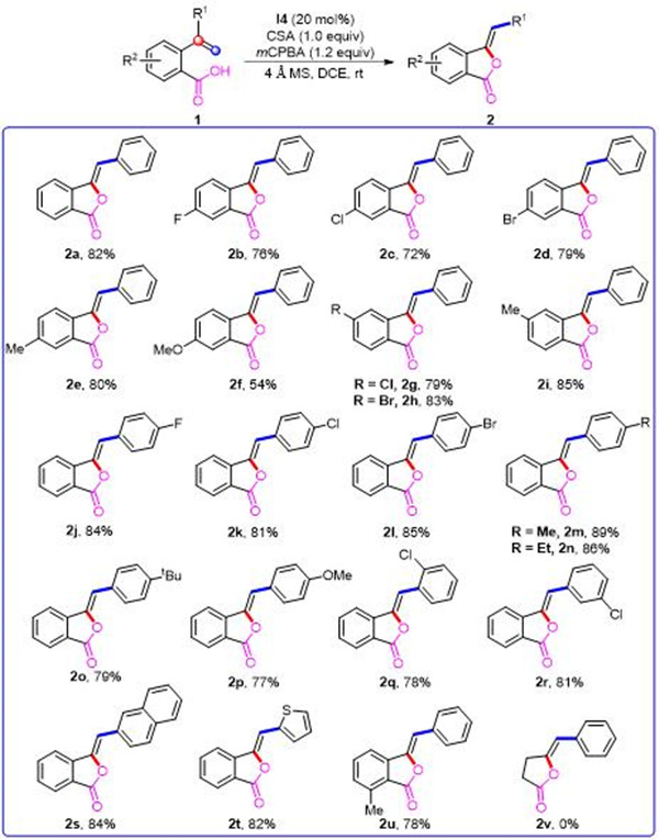 在获得了上述最佳条件之后,课题组对底物的适用范围进行了研究。首先,当取代基R1是芳香结构时,底物也表现出很好的耐受性,一系列吸电子基团和给电子基团取代的底物均能实现转化,得到芳香基团R1发生 1,2-芳基迁移的五元环异苯并呋喃酮类产物 2。值得注意的是,这类转化不适应于4-苯基-4-戊烯酸(1v)这类简单的不饱和羧酸底物。