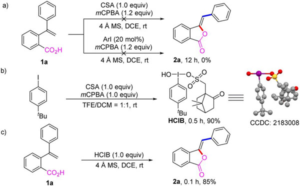 为了验证这种转化的反应机理,课题组在控制实验中对催化剂芳基碘苯和活化剂樟脑磺酸对该转化发生的必要性进行了验证,结果证明二者任何一种的缺失都会抑制该转化。并且通过便捷的一锅法合成了高价碘化合物 HCIB,并对其结构进行了 X-ray 晶体衍射表征;同时应用于反应底物 1a 的结果证实了介导该转化发生的关键物质正是反应体系中原位生成的 HCIB。