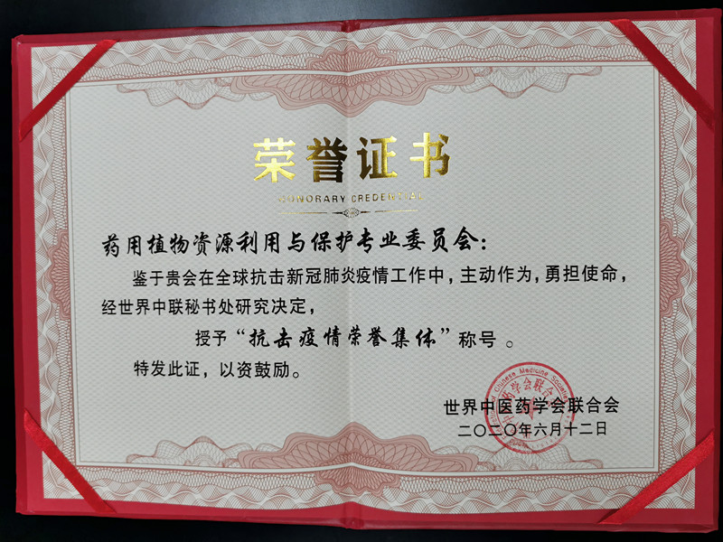 近期,世界中医药学会联合会授予 “世界中医药学会联合会药用植物资源利用与保护专业委员会”抗击疫情荣誉集体称号,以表彰该委员会在抗击疫情中主动作为,勇于担当的精神及做出的重要贡献。我院国家中药材产业技术体系岗位科学家高文远教授担任“世界中医药学会联合会药用植物资源利用与保护专业委员会”会长,王娟副教授和李霞副教授分别为第一和第二副秘书长。