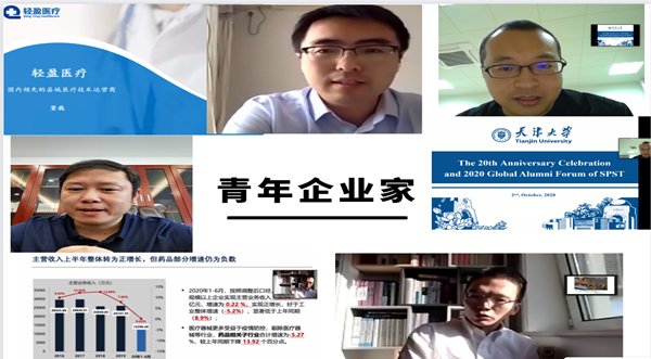 青年企业家沙龙由2009届本科生,上海复星医药市场经理龚昕主持。2004届硕士生、都创(上海)医药科技有限公司董事长/总经理王雷,2005届本科生、北京轻盈医院管理有限公司CEO董巍,2006 届博士生、天津睿创康泰生物技术有限公司董事长兼CEO贾慧娟,2007届硕士生、天津药物研究院有限公司党群工作部部长、行政经理赵丽丽,2009 届硕士生、昆药集团市场部总监兼特色口服事业部总经理武小军,2009届本科生、江苏恒瑞医药股份有限公司投资管理部高级经理王成共同参与论坛。青年企业家校友们为年轻的学弟学妹们提出了宝贵的职业规划建议,并表示希望广大校友秉承艰苦奋斗的精神,在中国医药行业乃至人类大健康领域发挥自己的优势,希望天大药学院培养出更多具有国际化视野的人才。
