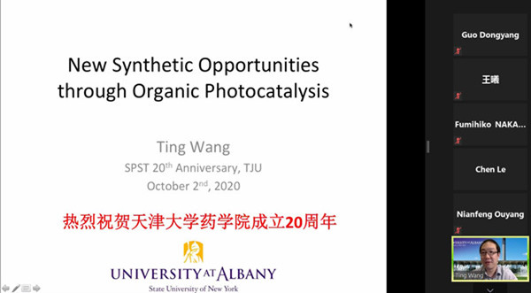 接下来,药学院高文远教授、Fumihiko Nakamura教授及2005届本科生校友美国纽约州立大学奥尔巴尼分校副教授王挺分别带来了“Modern Study on Traditional Chinese Medicine” “Mechanotransduction in pharmaceutical science and technology”和“New Synthetic Opportunities through Organic Photocatalysis”主题报告。