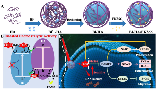 Scheme. Illustration of (A) prepare procedure of Bi-HA/FK866, and (B, C) mechanism of boosted photocatalytic activity induced NAMPT-regulating therapy for inhibiting tumor proliferation / migration /inflammation.