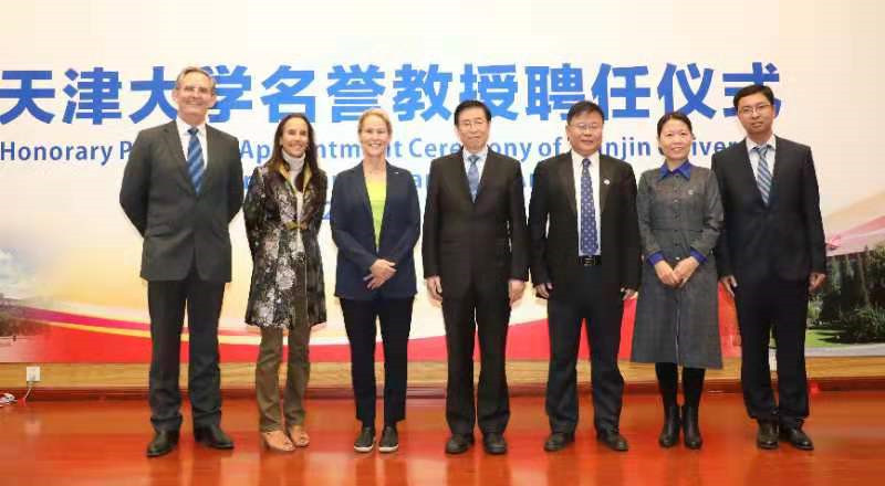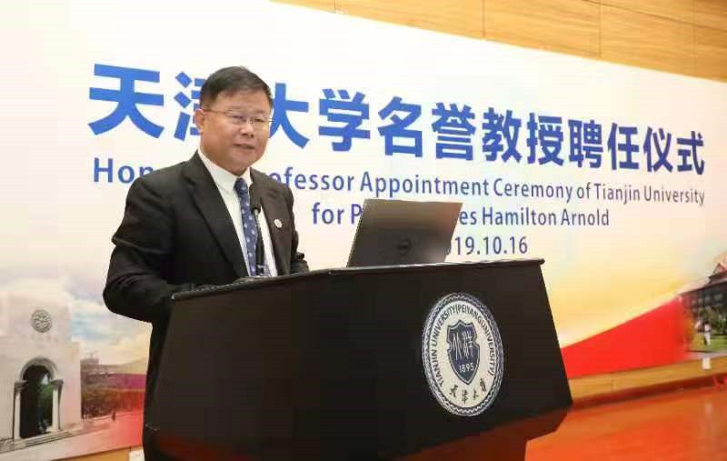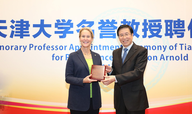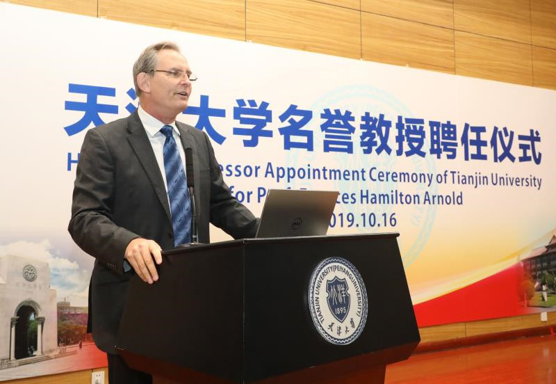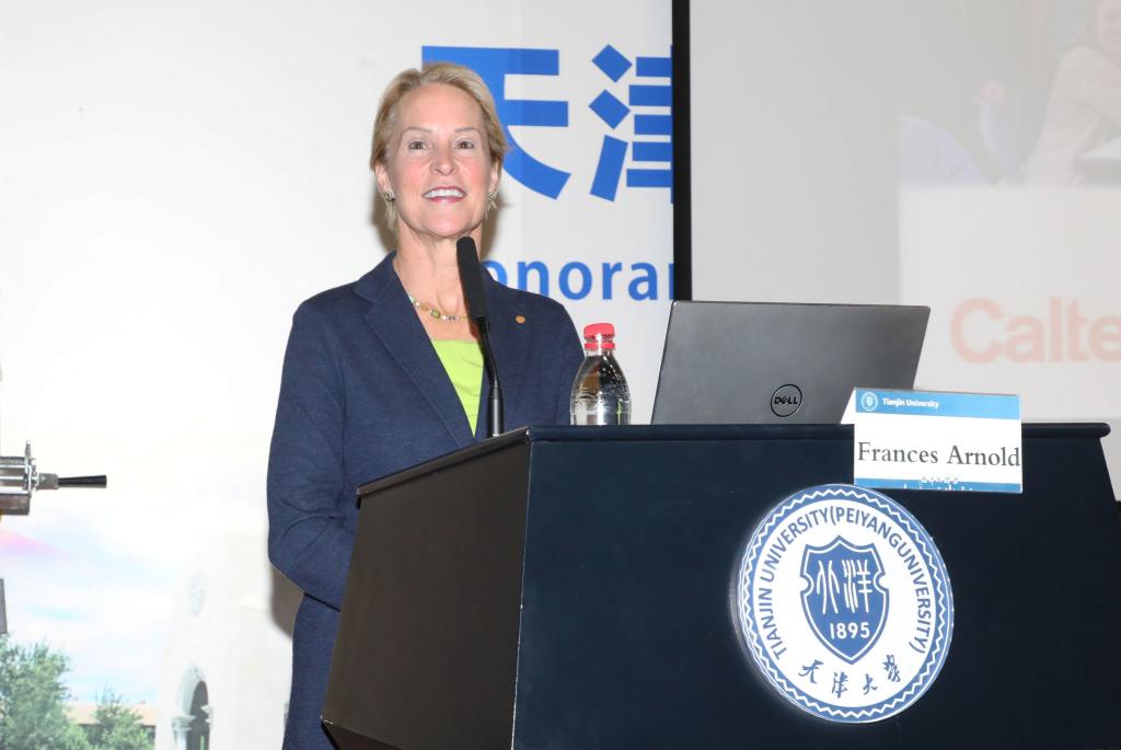 天津大学为Frances Arnold教授举行了隆重热烈简洁的名誉教授聘任仪式,校党委书记李家俊、副校长元英进等出席仪式,药学院院长Jay Siegel、党委书记冯翠玲及五百余名师生代表参加授予仪式,仪式由副校长元英进主持。