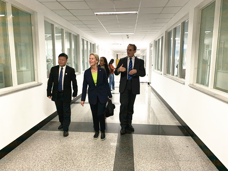 专家报告结束后,Frances Arnold教授在副校长元英进、药学院院长Jay Siegel、党委书记冯翠玲的陪同下参观了天津大学药学院仪器分析中心、本科实验中心、分子科学中心及学院的学术讨论区,并与Mark Olson教授及Jon Antilla教授进行科研交流。据悉,诺贝尔奖获得者Frances Arnold教授受药学院院长Jay Siegel邀请,将天津大学作为此次中国之行的第一站,未来计划与天津大学开展进一步的交流合作。
