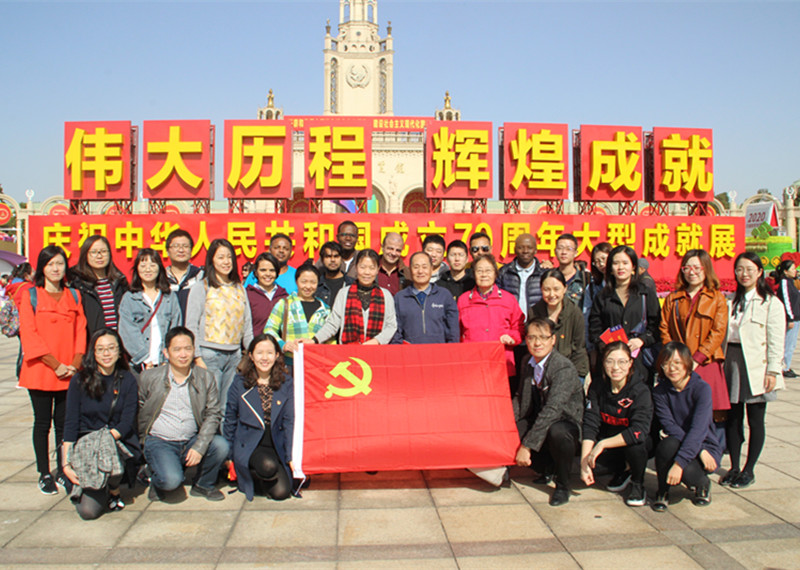 为推进“不忘初心、牢记使命”主题教育深入开展,10月20日,药学院党委与国际处党支部联合开展“我和我的祖国”主题党日活动,国际处处长张振、副处长谭超,药学院党委书记冯翠玲、党委副书记陈乐、副院长杜云飞、副院长张玲,国际处党支部党员、药学院教工党支部党员、药学院学生党支部党员、药学院外籍师生代表等参加此次活动。主题党日由参观“庆祝中华人民共和国成立70周年大型成就展”、大篷车党课、大篷车调研及师生分享等环节组成,形式丰富,内容充实。
