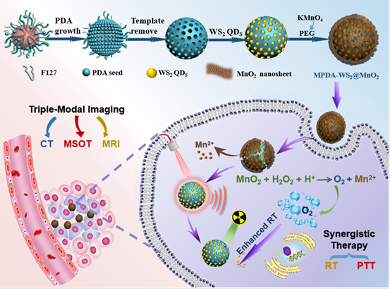 近日,我院李楠副教授课题组在生物材料领域知名杂志Biomaterials(IF=10.27)上发表了题为Oxygen-supplementing mesoporous polydopamine nanosponges with WS2 QDs-embedded for CT/MSOT/MR imaging and thermoradiotherapy of hypoxic cancer的研究论文,通过设计一种基于介孔聚多巴胺构筑的多功能纳米诊疗剂,将硫化钨量子点与二氧化锰精巧地整合于一体,可用于增强放射治疗/光热治疗联合应用,小鼠模型验证了应用该诊疗剂的联合治疗可在体内产生显著的抑瘤效果。该研究成果有望对设计新型的肿瘤诊断治疗材料提供了一种有效的策略。论文第一作者为2016级硕士王怡丹同学,天津大学药学院为研究成果第一完成单位。