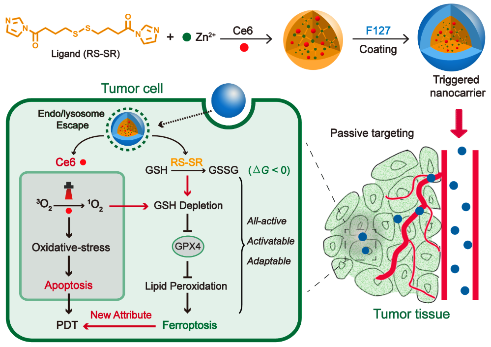 赵燕军教授团队以光动力学疗法为模型,发现其不仅能诱发凋亡,而且能够诱发细胞的程序性铁死亡。铁死亡是一类新型的细胞死亡模式,在形态学、生化、基因水平上均明显区别于凋亡、坏死、自噬,在逆转肿瘤耐药方面具有独特的优势。赵燕军教授团队发现光动力学疗法通过单线态氧大量消耗细胞内谷胱甘肽,间接降低谷胱甘肽过氧化酶4 (GPX4)的活性,进而诱发肿瘤细胞的铁死亡。同时,通过构建redox敏感型金属-有机框架纳米载体,不仅可实现光敏分子的可控递送,还可以强化细胞的程序性铁死亡,并通过体内外模型得到验证。