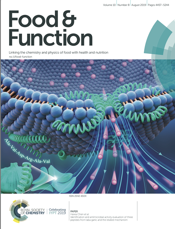 2019年8月,英国皇家化学学会旗下的国际著名科学期刊《Food & Function》(中科院分区一区,Top期刊)以封面文章的形式刊发了天津大学药学院陈海霞教授团队在天然抗菌肽鉴定及作用机制方面取得的科研成果《Identification and antimicrobial activity evaluation of three peptides from laba garlic and the related mechanism》(DOI: 10.1039/c9fo00236g)。论文第一作者是药学院博士生高旭东,通讯作者为陈海霞教授,天津大学为第一署名单位。