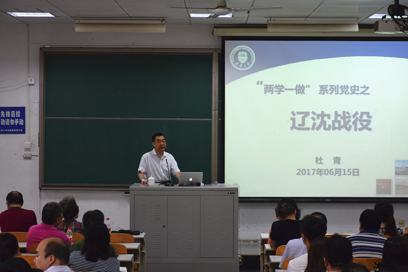 2017年6月15日,天津大学人事处处长杜青在24教学楼201教室讲授题为“‘两学一做’系列党史之辽沈战役”的专题党课,党课由药学院党委书记冯翠玲主持,内燃所、生命学院、地科院、海洋学院及药学院五个单位的师生党员共计200余人聆听了此次专题党课。