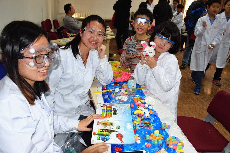 活动全天由药学院、生命学院的学生志愿者进行循环趣味化学互动展示,每一位到场的小朋友都被分发了专业化学实验所需的佩戴的护目镜和实验服,体验当一次化学家的感觉,各年龄段小朋友们都亲自参与其中,动脑与动手相结合。活动一共包含十个趣味化学实验,分别帮助大家体会和理解聚合物、指示剂、固体和液体、乳化剂、紫外线、离子导电、发光分子、原子拼接等相关的原理和现象。小朋友们在家长的陪同下去组接自己喜爱的形状、感受荧光棒发光的过程、尝一尝口香糖和巧克力在嘴里融化的感觉……成功体验所有实验的小朋友们还得到了小熊、餐具、图书等丰富的奖品。