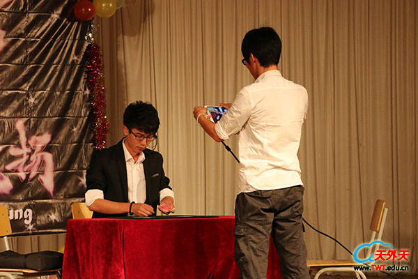 视频结束后,由五个“萌妹子”表演的开场舞瞬间点燃了全场。她们用活泼可爱的动作跳了一段《恋爱中的幸福曲奇》,旁边的微信墙上也时不时的登出几条调侃:“学长,口水收收!”英文歌手大赛亚军随即送上一首深情的英文歌,引起台下女生的一片尖叫。 高数月考满分的于伟龙,成功地用一首《滚滚长江东逝水》证明了自己的多才多艺。他身着西服,用浑厚的嗓音向观众演绎了一段战火传奇的无奈与哀伤,将大家带回到那个三国争霸、群雄逐鹿的年代里去。他昂首挺胸,历史仿佛就从他的面前流过,奔涌到观众席中,激荡在每一个人的心头,让人生出“大江东去,浪淘尽,千古风流人物”的豪迈情感。