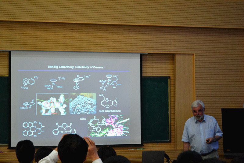 报告题为“(手性)铁、钌路易斯酸的合成及其在[3+2]和[4+2]环加成反应中的应用(Iron- and Ruthenium-Lewis Acids. Syntheses and Applications in [3+2] and [4+2] Cycloaddition Reactions)”。Kündig教授首先介绍了“合成手性铁和钌路易斯酸的新方法”,表示该方法已被成功应用到Diels-Alder [4+2]环加成反应中,取得了很好的收率和很高的立体选择性。随后,他还向师生们介绍了如何利用烯醛和1,3-偶极子的[3+2]环加成反应、烯酮和1,3偶极子的[3+2]环加成反应,高收率、高立体选择性合成手性杂环化合物。会后,Kündig教授与会者进行了热烈的交流和讨论,耐心详尽的回答了师生们的提问。
