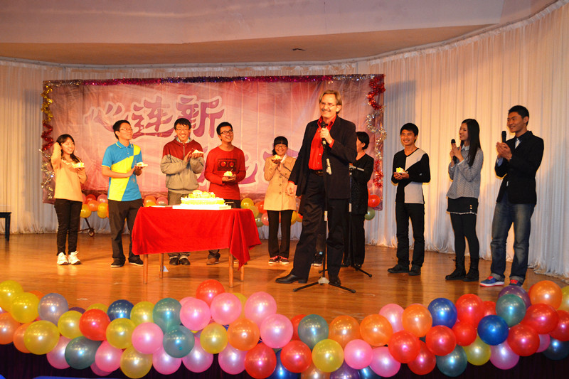 由同学们自编自演的开场视频诙谐幽默,使场内气氛迅速活跃起来,舞台一侧的人人墙也开始飞速滚动,观众渐渐融入了晚会的节奏。 视频播放完毕,全场灯光熄灭,随着一阵动感十足的音乐,灯光再次亮起时,身着白大褂的药院全体大一男生已经背对观众站好队形,他们潇洒地甩掉身上的白大褂,带来了一段帅气与搞笑兼具的集体舞,将现场气氛带入高潮。 接下来,是一曲小提琴合奏的《小步舞曲》,缓缓流动的音符、细腻婉转的旋律,将观众引入了文艺的殿堂。一曲终了,一首女声合唱《你被写在我的歌里》清新欢快,将珍贵的友谊诠释淋漓。 在观众们尽情享受听觉盛宴之后,第一幕的最后一个节目——相声《西征梦》亮相了,两位相声演员风趣幽默的对话,时而相互吹捧时而相互调侃,引得现场观众捧腹。 第一幕结束,中场环节集体生日开始,由药学院院长Jay Siegel和党总支书记冯翠玲分别为大一新生寄语并为10月份过生日的新生分发蛋糕,现场生日歌响起,温馨欢乐的药学院大家庭其乐融融,欢聚一堂。