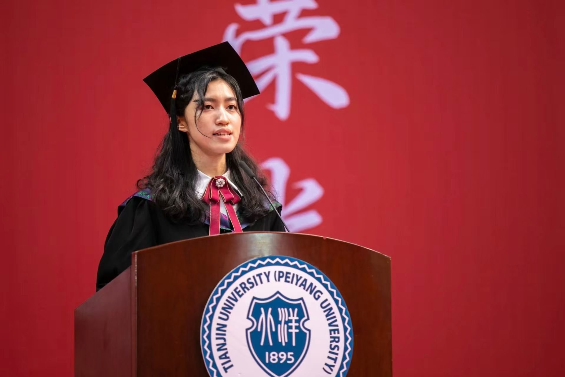 去年,我作为北洋合唱团的一员,站在毕业典礼的台前领唱校歌;而今天,我作为毕业生代表,站在这里向母校告别。回顾这段留学旅程,从最初的青涩懵懂到如今的收获满满,母校和老师们的关心关爱,是这段旅程中最动人的印记。亲爱的同学们,我们正站在人生的十字路口,我希望同大家一起永远保持对知识的渴望、对创新的热忱和对梦想的执着,牢记“实事求是”的校训,奋勇拼搏,在人生舞台上绽放光芒!