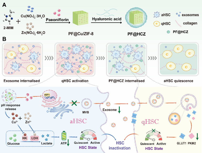 李楠教授团队长期致力于肝纤维化治疗研究,其多篇论文(Adv. Mater.2024, 2406590; Adv. Func. Mater. 2024, 2309690; Acta. Pharm. Sin. B, 2023,13 (12): 5030-5047)深入探究肝纤维化演进的多种机制及潜在靶点,并从不同角度提出创新治疗策略。本研究开发了新型细胞间通讯干扰治疗策略,构建了特异性靶向aHSCs的芍药苷负载铜掺杂ZIF-8纳米材料(PF@HA-Cu/ZIF-8, PF@HCZ)。该纳米系统通过双重机制实现抗纤维化效应:① 靶向抑制aHSCs能量代谢相关外泌体分泌,阻断对邻近qHSCs的活化诱导;② 通过释放的Cu2?/Zn2?抑制糖酵解关键酶活性,减少生物能量合成,促使aHSCs恢复静息表型,进而协同降低外泌体及细胞外基质分泌。研究表明,PF@HCZ能够通过维持aHSCs与qHSCs的代谢休眠状态,最终显著缓解肝纤维化病理进程。这一发现为通过靶向细胞间通讯和重塑代谢稳态的抗纤维化治疗提供了创新性策略。