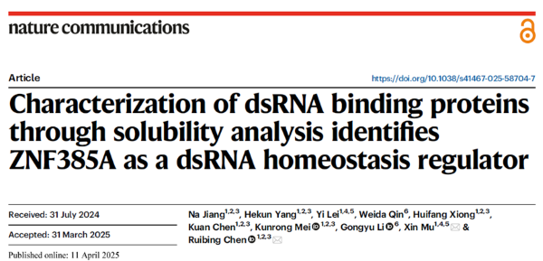 近日,天津大学医学部药学院陈瑞冰教授团队和穆昕副教授团队联合在Nature Communications发表题为 Characterization of dsRNA Binding Proteins through Solubility Analysis Identifies ZNF385A as a dsRNA Homeostasis Regulator 的研究论文。该研究建立了一种通过蛋白质组溶解度分析鉴定dsRNA结合蛋白的新方法,并在此基础上发现锌指蛋白ZNF385A作为一个新的dsRNA结合蛋白对内源性dsRNA稳态起到关键性调控作用,为其在肿瘤免疫治疗中的潜在应用提供了重要的分子基础。