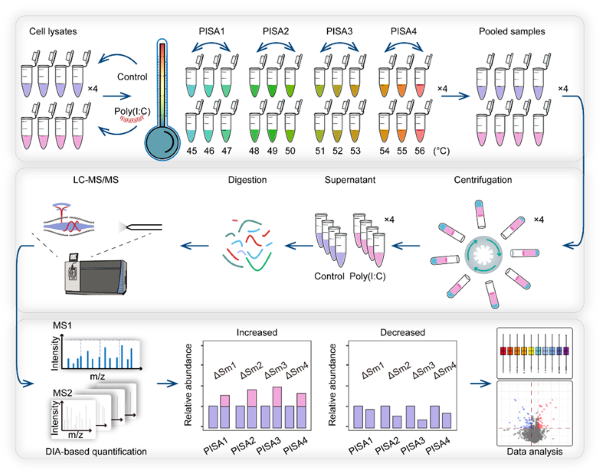 陈瑞冰课题组在既往研究中,围绕RNA结合蛋白的质谱分析方法及其分子机制开展了一系列工作(Nat Commun 2020,Mol Cell Proteomics 2021,Anal Chim Acta 2021,Nucleic Acids Res 2017),为深入理解RNA与蛋白质这两种生物大分子间相互作用的生物学意义提供了诸多新颖的见解。在本研究中,团队发现dsRNA能够诱导其结合蛋白在加热处理后出现溶解度的显著变化,并基于此原理建立了一种新的dsRNA结合蛋白检测技术,研究结果极大地拓展了目前已知dsRNA结合蛋白的范畴。