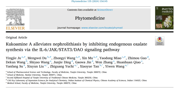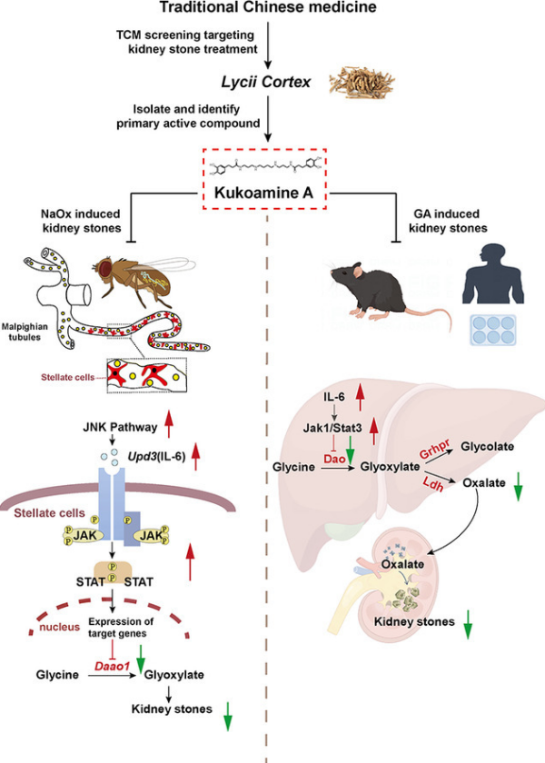 近日,天津大学医学部药学院汪以馼教授与南开大学谭小月教授课题组合作,在《Phytomedicine》期刊发表了一篇题为“Kukoamine A alleviates nephrolithiasis by inhibiting endogenous oxalate synthesis via the IL-6/JAK/STAT3/DAO signaling pathway”的研究论文。研究利用果蝇和小鼠模型,发现地骨皮中的活性成分地骨皮甲素(KuA)通过激活JAK/STAT信号通路抑制内源性草酸的合成,从而减少草酸钙的形成。这一发现为草酸钙结石及高草酸尿症的治疗提供了新路径。