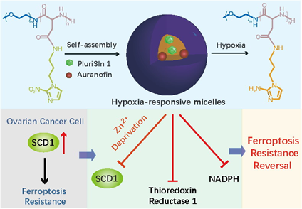 卵巢癌是一种典型的女性生殖系统疾病,据美国癌症协会报导,每78 人中就有1 人被诊断为卵巢癌,每108 人中有1 人死于卵巢癌。采用一线、二线、三线化疗药物导致应答持续时间越来越短,并迅速出现严重耐药表型。铁死亡是一种铁离子依赖的调控性细胞死亡方式,近年来靶向细胞铁死亡被广泛用来解决传统抗癌疗法的耐药性问题。然而,部分卵巢癌患者过表达硬脂酰辅酶A去饱和酶1 (SCD1),进而诱发脂质代谢重编程,导致患者对铁死亡疗法应答性显著降低。SCD1是催化饱和脂肪酸向单不饱和脂肪酸转化的关键限速酶,锌离子(Zn2+) 是SCD1的辅因子,决定了SCD1的活性及卵巢癌铁死亡疗法的耐药性。