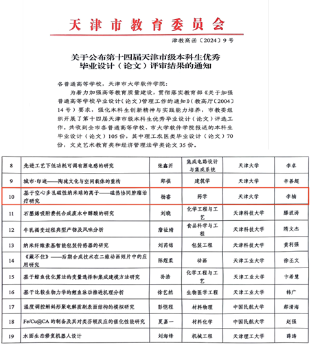 近日,天津市教委公布第十四届天津市级本科生优秀毕业设计(论文)评审结果,我院2019级本科生杨睿(现就读于斯坦福大学,曾获2021年度本科生国家奖学金)毕业设计(论文)被评为第十四届天津市级本科生优秀毕业设计(论文)。