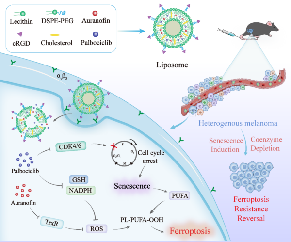 图1. 靶向脂质体通过细胞周期调控和辅酶衰减逆转黑色瘤铁死亡耐药示意图