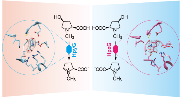 近日,天津大学药学院张雁教授团队在ACS Catalysis发表了题为“Glycyl Radical Enzymes Catalyzing the Dehydration of Two Isomers of N-Methyl-4-hydroxyproline”的研究论文。该论文报道了属于GRE家族的两个新脱水酶,这两个GRE(论文中命名为HpyG和HpzG)分别催化互为对映体的顺式-L-氮甲基羟脯氨酸和顺式-D-氮甲基羟脯氨酸的脱水反应。