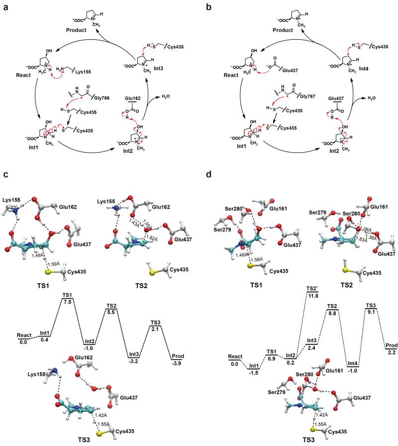 a-b) HpyG和HpzG的催化机理图; c-d) HpyG和HpzG催化反应的势能图(kcal/mol)