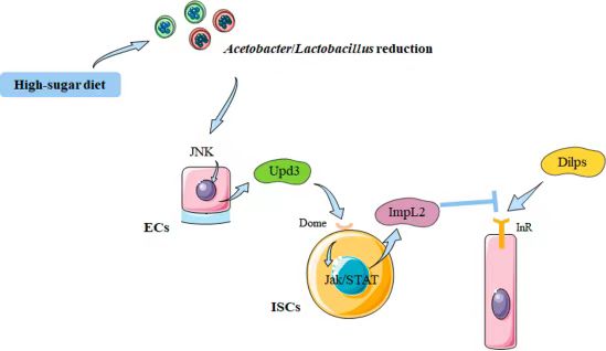 研究结果显示,高糖饮食显著减少了果蝇肠道菌群的数量和多样性,特别是醋酸菌属和乳酸菌属的数量急剧下降。通过喂食醋酸菌,研究小组首次揭示了醋酸菌通过调节果蝇肠道中的JNK-JAK/STAT信号通路活性,减轻胰岛素抵抗症状。