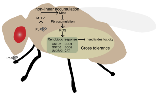 此外,金属代谢途径和外源反应途径之间的相互作用也导致了铅暴露下的黑腹果蝇对杀虫剂和其他有机毒素的交叉耐受性。铅中毒引起的氧化应激可能是链接机体内对无机有害物质和有机有害物质解毒反应的桥梁。这项研究揭示了一种环境重金属污染影响农业生态的全新机制。