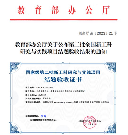 为扎实推进新工科建设,教育部组织开展了第二批国家级新工科研究与实践项目结题验收工作。经项目组申请、专家网络评审、专家会议评审等环节,本批共820个项目通过验收,其中120个项目验收结果为优秀。我院新工科项目《扎根中国大地,探索新工科建设国际化人才培养新模式》结项验收结果为“优秀”。