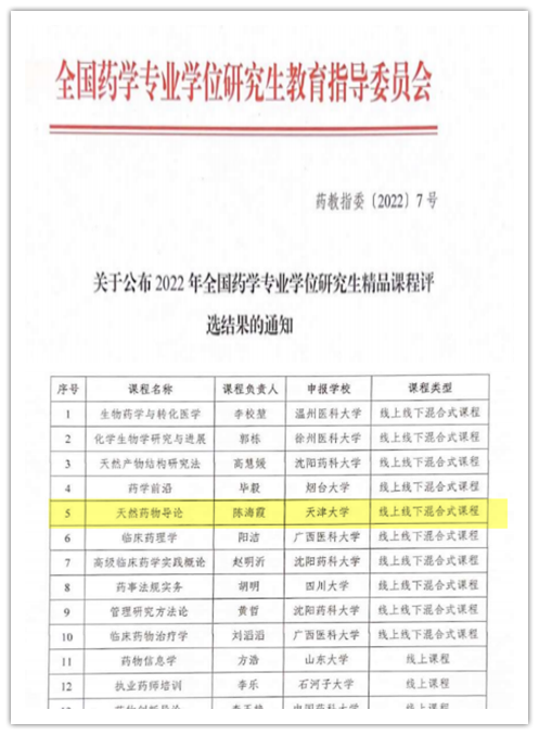 近期,全国药学专业学位研究生教育指导委员会公布了2022年全国药学专业学位研究生精品课程评审结果,药学院陈海霞教授负责的线上线下混合式课程《天然药物导论》获评为研究生精品课程。