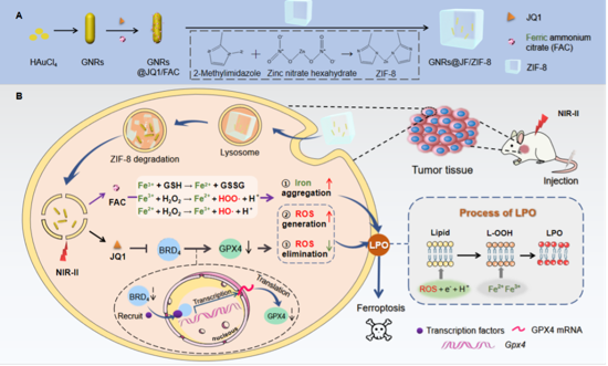 本文设计具有pH响应的金属有机框架(Metal-Organic Framework,MOF)结构,并将具有近红外二区(NIR-II)吸收的纳米金棒(gold nanorods,GNRs)包覆其中,巧妙合成了火柴盒形貌的纳米载体(图2),在酸性肿瘤微环境下降解,释放负载的铁离子补充剂柠檬酸铁铵(FAC)和铁死亡相关蛋白抑制剂JQ1。一方面FAC通过芬顿反应产生铁死亡依赖的铁离子和活性氧ROS,另一方面JQ1下调GPX4的表达从而放大细胞铁死亡的作用。同时火柴盒内部结构纳米金棒在近红外二区激光照射下通过局域表面等离子体共振(LSPR)和高光热转换效率,实现联合PTT治疗肿瘤作用。本文从体内/体外等实验详细探究了这种pH响应及近红外二区增强的纳米递送体系用于放大的铁死亡治疗策略及效果。