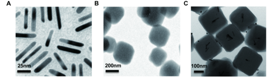 图2. 透射电镜图 A)GNRs;B)ZIF-8;C)GNRs@JF/ZIF-8