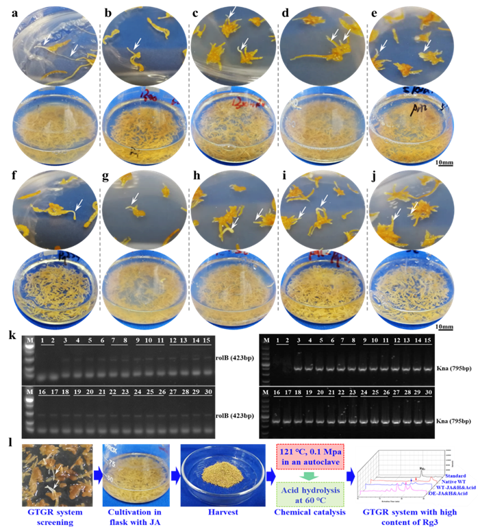 研究从基因水平、蛋白水平和组织水平综合调控Rg3在人参底盘中的合成。首先通过半理性设计提高了Rg3合成关键酶Pq3-O-UGT2的催化效率。利用基因编辑方法抑制了Rg3合成的侧支途径。研究还发现,过表达木质素合成基因PAL促进了木质部的增厚,扩大了Rg3的合成区域,显著提升了Rg3含量。通过代谢途径的创建构建了高产Rg3人参根系,最终通过诱导刺激和酸水解使根系中Rg3产率达到83.6 mg/L,为Rg3的高效和绿色合成提供了新的合成生物学平台,对中药资源可持续利用和高质量发展具有重要意义。