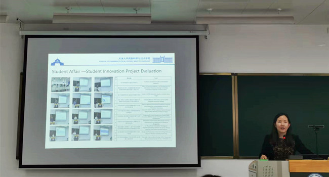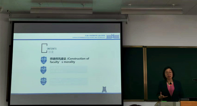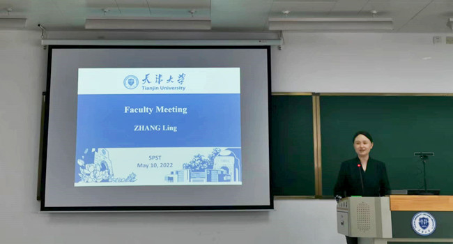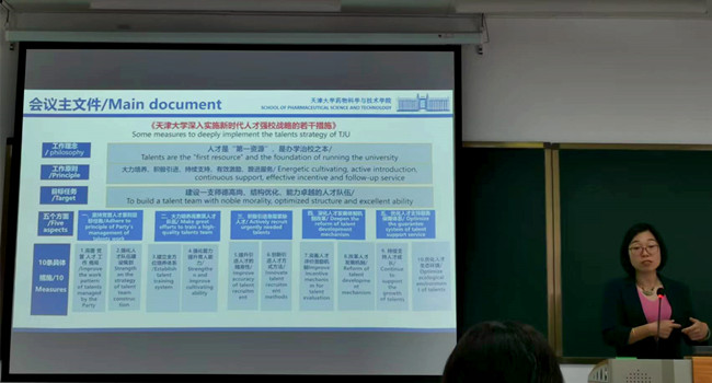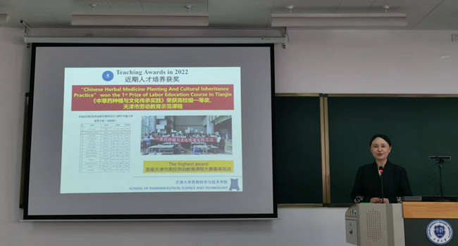 党委副书记、副院长张玲向中外教职工详细讲解首次研究生学位论文盲审、疫情期间答辩和博士生招生计划指标分配改革举措,通报学院近期人才培养成果,完成10门研究生核心课程建设、《中草药种植与文化传承实践》荣获首届天津市高校劳动教育课程大赛最高奖项、学院本科生及研究生人才培养体系分获2021年天津大学教学成果特等奖及天津大学研究生教育成果特等奖等。