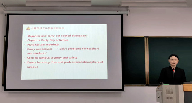党委副书记、副院长张玲用英文向全院中外教师介绍2022年“迎盛会、铸忠诚、强担当、创业绩”主题学习宣传教育实践活动工作要求及十项重点任务,并结合学院实际,切实推进示范化学院中用党的创新理论武装党员、教育师生,用英文向学院中外教职工介绍近十几年来习近平总书记视察高校的工作情况,传达习近平总书记在中国人民大学考察调研时的重要讲话精神、重温习近平总书记考察清华大学时的重要讲话精神和2009年到天津大学考察的情况。
