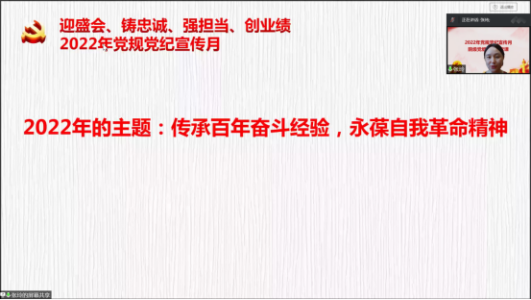 为深入学习贯彻习近平新时代中国特色社会主义思想和党中央关于全面从严治党的系列决策部署要求,认真落实《关于加强新时代廉洁文化建设的意见》,结合《天津大学2022年党规党纪宣传月活动实施方案》总体要求,根据“迎盛会、铸忠诚、强担当、创业绩”主题学习宣传教育实践活动安排,2022年5月26日13:30,学院党委副书记、副院长张玲面向全体教工党员和学生党员代表讲授专题党课,党课由教工第二党支部书记刘子川主持。